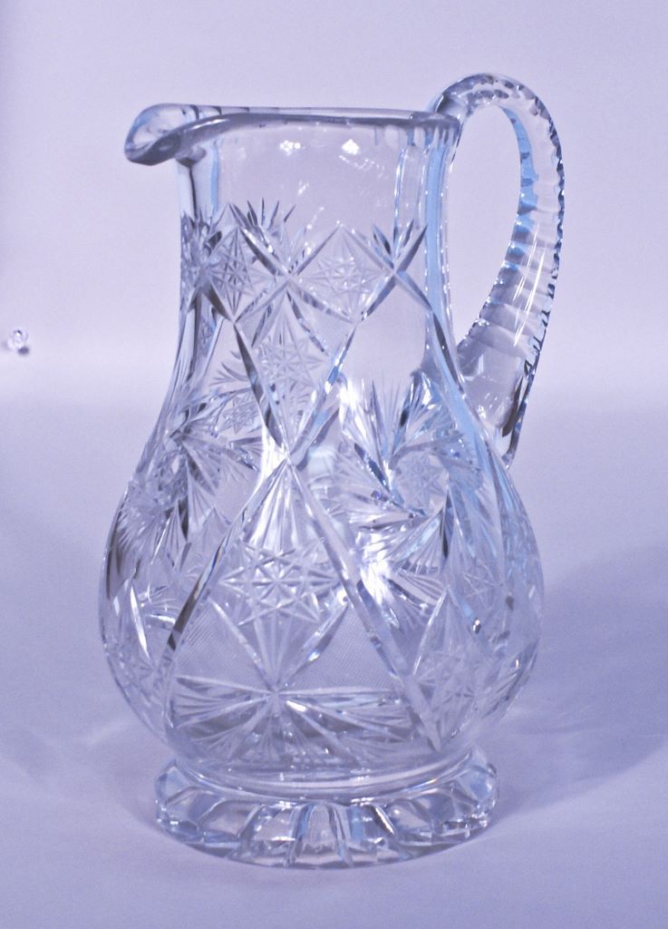 A West German Cut Glass 10" water pitcher in a hobstar and pinwheel pattern. A West German Cut Glass 10" water pitcher in a hobstar and pinwheel pattern.