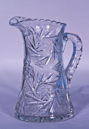 An American Brilliant Cut Glass 9" water pitcher cut in a pinwheel pattern. An American Brilliant Cut Glass 9" water pitcher cut in a pinwheel pattern.