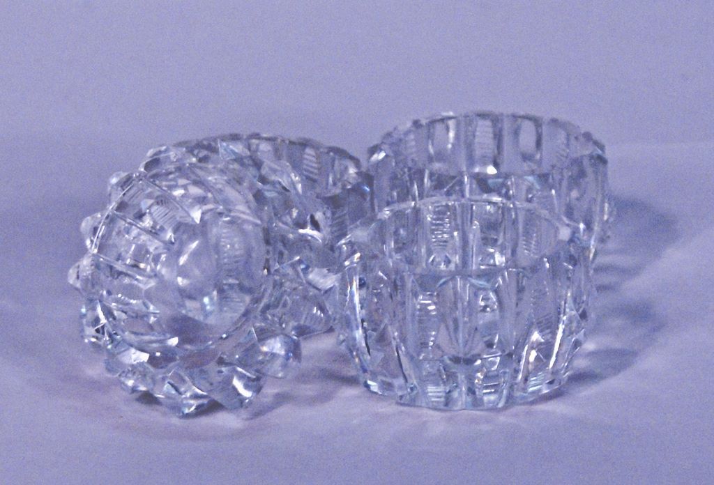 A matched set of four cut glass salt dips with deep vertical cross-hatched cutting, each 1 3/8"dia. A matched set of four cut glass salt dips with deep vertical cross-hatched cutting, each 1 3/8"dia.