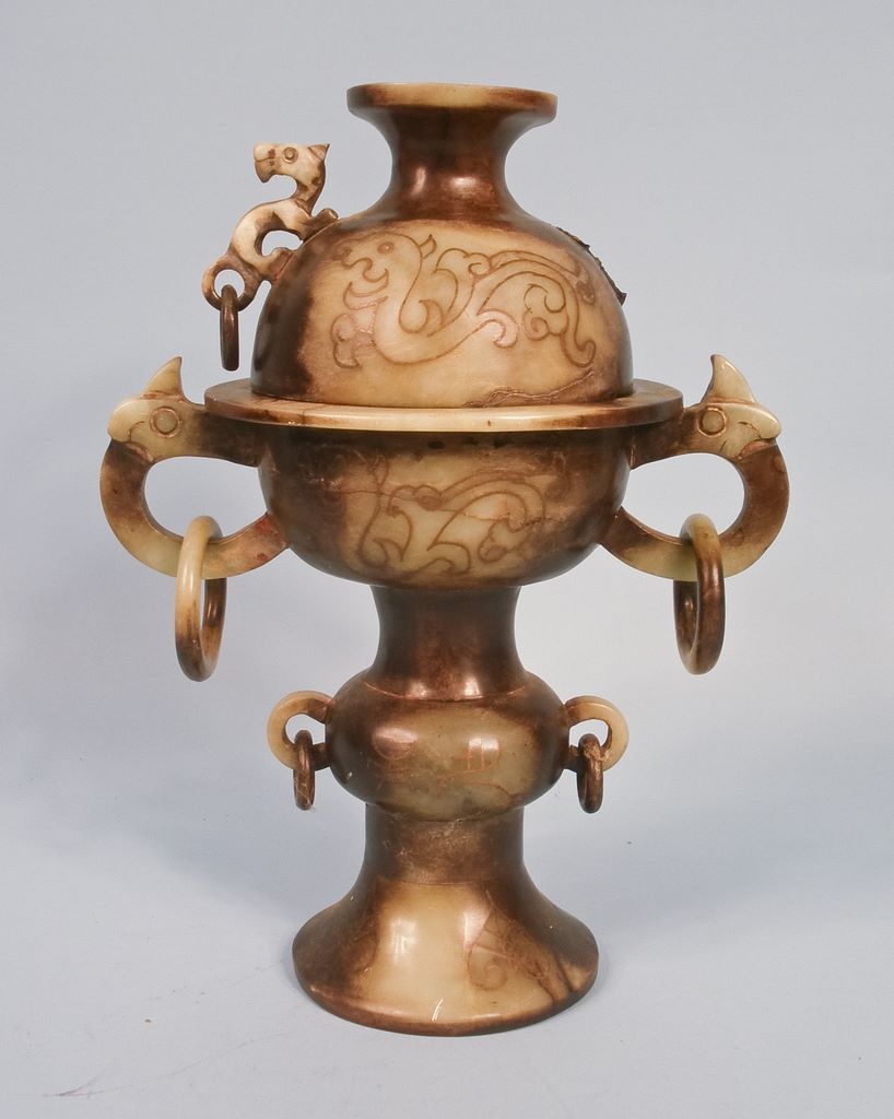 A 12 1/4"h carved Chinese covered urn of jade-colored hardstone, inlaid in cloisonn A 12 1/4"h carved Chinese covered urn of jade-colored hardstone, inlaid in cloisonn