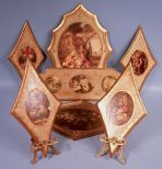 A grouping of eight gilded Italian wooden "Florentine" wall plaques with floral and courtship scenes: Four are 8"w x 14 3/8"h; one 18 1/2"h x 13"w; one 18"h x 6 1/2"w, one 21"h x 12 1/2"w, and the last 7" round. A grouping of eight gilded Italian wooden "Florentine" wall plaques with floral and courtship scenes: Four are 8"w x 14 3/8"h; one 18 1/2"h x 13"w; one 18"h x 6 1/2"w, one 21"h x 12 1/2"w, and the last 7" round.