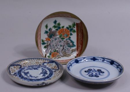 A grouping of three late 19th Century Japanese gilt Imari bowls, each 4 3/4"w; two primarily decorated in blue and overglaze gilt, the third featuring a fierce foo dog crouching among peony blossoms. A grouping of three late 19th Century Japanese gilt Imari bowls, each 4 3/4"w; two primarily decorated in blue and overglaze gilt, the third featuring a fierce foo dog crouching among peony blossoms.