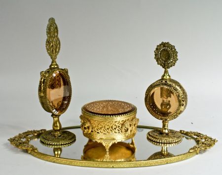 853 Gold Filigree Perfume Bottles & Jewelry Box on a Mirror Plateau, 4 Items Total