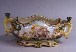 A gilded and hand painted Capodimonte mantle centerpiece with winged Muse handles, 12"w x 5 1/2"h, showing two scenes in bas relief of satyrs leading man to earthly pleasures, while cherubs attempt to drag him away. Marked in overglaze gilt script, "Capodimonte Italy." A gilded and hand painted Capodimonte mantle centerpiece with winged Muse handles, 12"w x 5 1/2"h, showing two scenes in bas relief of satyrs leading man to earthly pleasures, while cherubs attempt to drag him away. Marked in overglaze gilt script, "Capodimonte Italy."