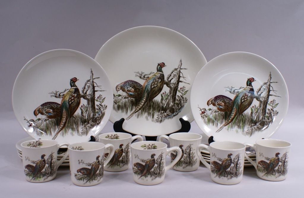 A eighteen piece set of Johnson Brothers "Pheasant" Game Birds china, comprised of ten 11 1/4" plates, seven 3 3/8"h mugs, and a 14 3/4" platter. Small nick to one mug, two mugs have darkened interior crazing. A eighteen piece set of Johnson Brothers "Pheasant" Game Birds china, comprised of ten 11 1/4" plates, seven 3 3/8"h mugs, and a 14 3/4" platter. Small nick to one mug, two mugs have darkened interior crazing.