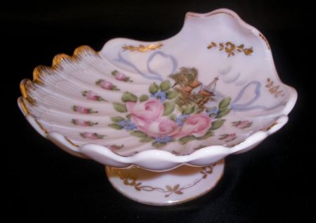 A Cambridge "Crown Tuscan" seashell compote with a rarely seen Charleton decoration of a seascape scene, 8 1/2"w x 5 1/4"h. A Cambridge "Crown Tuscan" seashell compote with a rarely seen Charleton decoration of a seascape scene, 8 1/2"w x 5 1/4"h.
