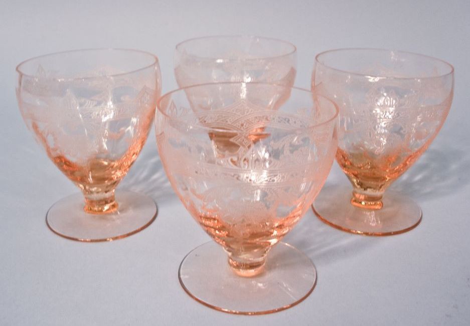 A set of four Heisey pink/Flamingo #3380 "Old Dominion" footed tumblers with #447 "Empress" etching, each 3 1/8"h with a 2 1/2" diameter rim, produced 1928-1937. One tumbler has interior rim-edge speck nicks. A set of four Heisey pink/Flamingo #3380 "Old Dominion" footed tumblers with #447 "Empress" etching, each 3 1/8"h with a 2 1/2" diameter rim, produced 1928-1937. One tumbler has interior rim-edge speck nicks.