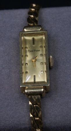 A Rene Pavet lady's 14 karat yellow gold watch with an after market link band, not running. A Rene Pavet lady's 14 karat yellow gold watch with an after market link band, not running.