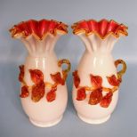 A matched pair of late 19th Century hand blown English art glass 10 1/2" mantle vases of opaline glass cased over cranberry, with amber cresting to the sharply crimped edges. Both vases have an elaborate applied flower trails in amber, which amazingly is in flawless condition. A matched pair of late 19th Century hand blown English art glass 10 1/2" mantle vases of opaline glass cased over cranberry, with amber cresting to the sharply crimped edges. Both vases have an elaborate applied flower trails in amber, which amazingly is in flawless condition.