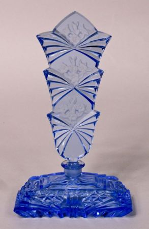 A marked Czechoslovakia Art Deco 8"h perfume bottle of blue cut glass with an exceptional 6 1/4" floral & fan cut stopper. A marked Czechoslovakia Art Deco 8"h perfume bottle of blue cut glass with an exceptional 6 1/4" floral & fan cut stopper.