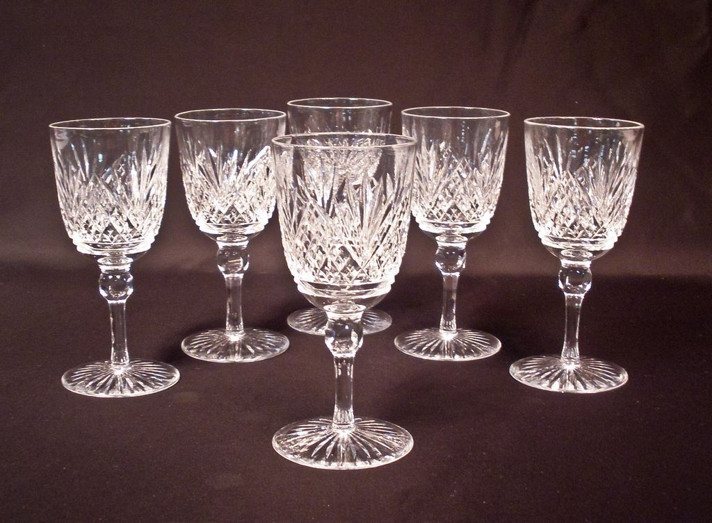 A matched set of six English cut glass 5"h wine stems in a pineapple and fan pattern, all signed Webb. A matched set of six English cut glass 5"h wine stems in a pineapple and fan pattern, all signed Webb.