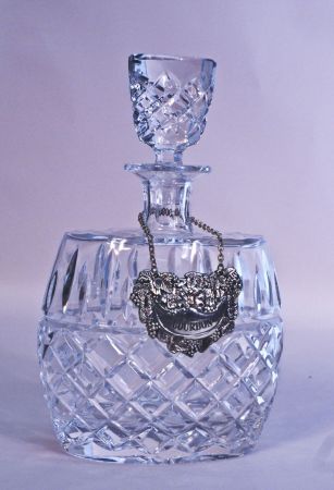 A 10"h cut glass decanter with a silverplate bourbon tag, of fine Waterford quality crystal. A 10"h cut glass decanter with a silverplate bourbon tag, of fine Waterford quality crystal.