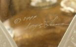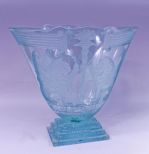 A monumental 16"h x 17 3/4"w Jorge Luna carved glass sculpture from his "Vase Series", deeply carved with winged griffins among classical motifs, mounted on a three-tiered glass "marble plinth" base. Fully signed on the side, "Jorge Luna 1999", with small glass dent/polished chip to edge, likely a production flaw. A monumental 16"h x 17 3/4"w Jorge Luna carved glass sculpture from his "Vase Series", deeply carved with winged griffins among classical motifs, mounted on a three-tiered glass "marble plinth" base. Fully signed on the side, "Jorge Luna 1999", with small glass dent/polished chip to edge, likely a production flaw.