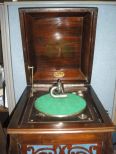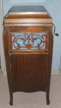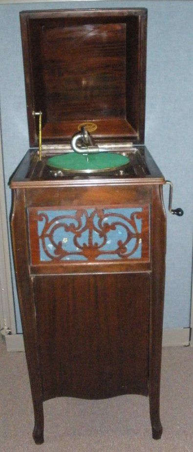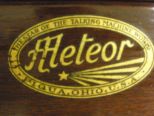 A c1910 mahogany parlor victrola in working condition, manufactured by Meteor, "The Star of the Talking Machine World". With lift-up door to 78rpm record storage, 45"h x 19 1/2"w x 22 3/4"d. A c1910 mahogany parlor victrola in working condition, manufactured by Meteor, "The Star of the Talking Machine World". With lift-up door to 78rpm record storage, 45"h x 19 1/2"w x 22 3/4"d.