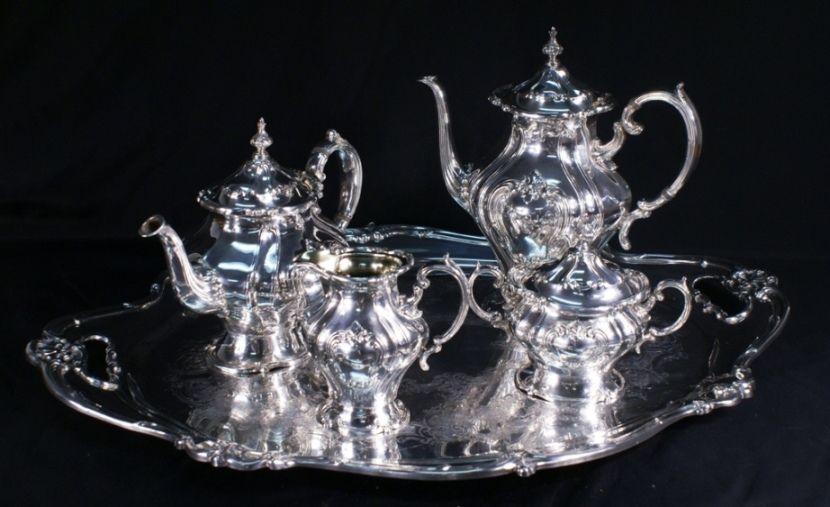 An ornate Gorham silverplate five piece coffee and tea service including a 11"h coffee pot, 8 1/2"h teapot, 5"h creamer and sugar, and 26" x 19" handled serving tray. In flawless condition, professionally polished. An ornate Gorham silverplate five piece coffee and tea service including a 11"h coffee pot, 8 1/2"h teapot, 5"h creamer and sugar, and 26" x 19" handled serving tray. In flawless condition, professionally polished.