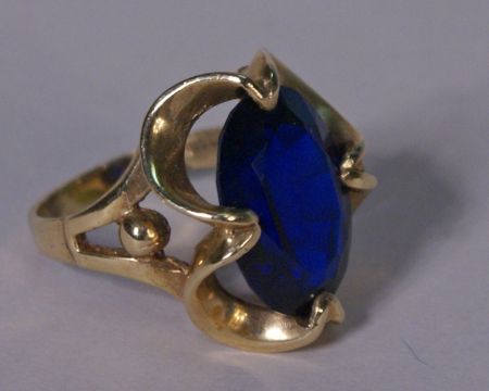 A ladies ring with a synthetic blue stone measuring 18 x 13 in a stamped 10 karat mount. A ladies ring with a synthetic blue stone measuring 18 x 13 in a stamped 10 karat mount.