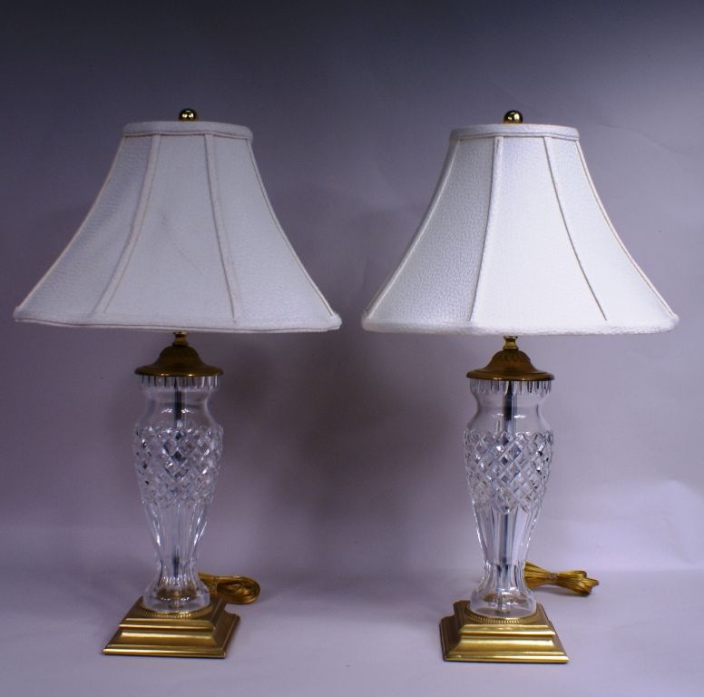 A matched pair of Waterford Crystal "Lismore" table lamps with original finials and original tagged Waterford shades, 27"h to top of finials. A matched pair of Waterford Crystal "Lismore" table lamps with original finials and original tagged Waterford shades, 27"h to top of finials.