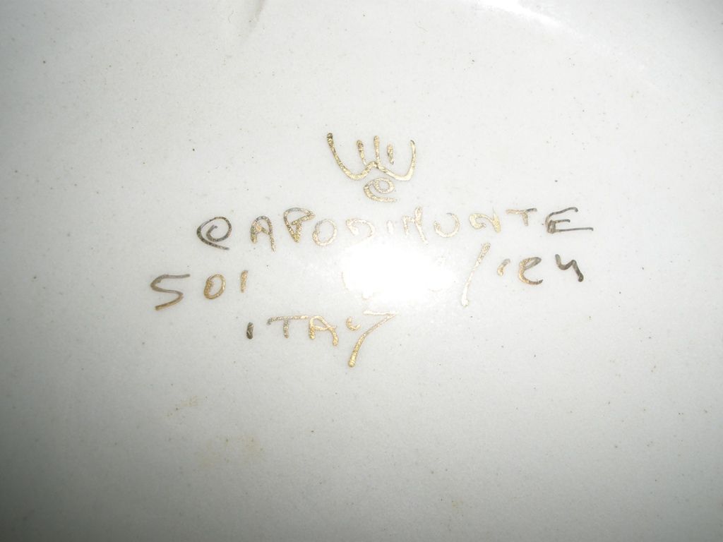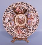 A dramatic 14 1/2" Capodimonte reticulated wall plate, richly hand painted with classical scenes of land and sea. In very fine condition, foot rim factory pierced for hanging. Marked in overglaze gilt with a stylized Crown-over-E, various numbers, and "Italy". A dramatic 14 1/2" Capodimonte reticulated wall plate, richly hand painted with classical scenes of land and sea. In very fine condition, foot rim factory pierced for hanging. Marked in overglaze gilt with a stylized Crown-over-E, various numbers, and "Italy".