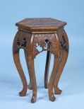 A late 19th Century American quarter sawn oak carved Moorish tea table, 18 3/4"h x 12" hexagonal, with hand carved side panels. A late 19th Century American quarter sawn oak carved Moorish tea table, 18 3/4"h x 12" hexagonal, with hand carved side panels.