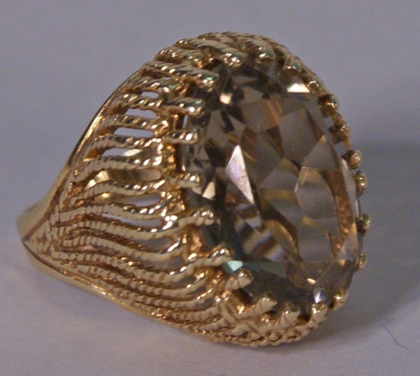 A ladies smoky quartz ring with a 20 x 15 oval shape stone set in a 14 karat yellow gold mounting. A ladies smoky quartz ring with a 20 x 15 oval shape stone set in a 14 karat yellow gold mounting.