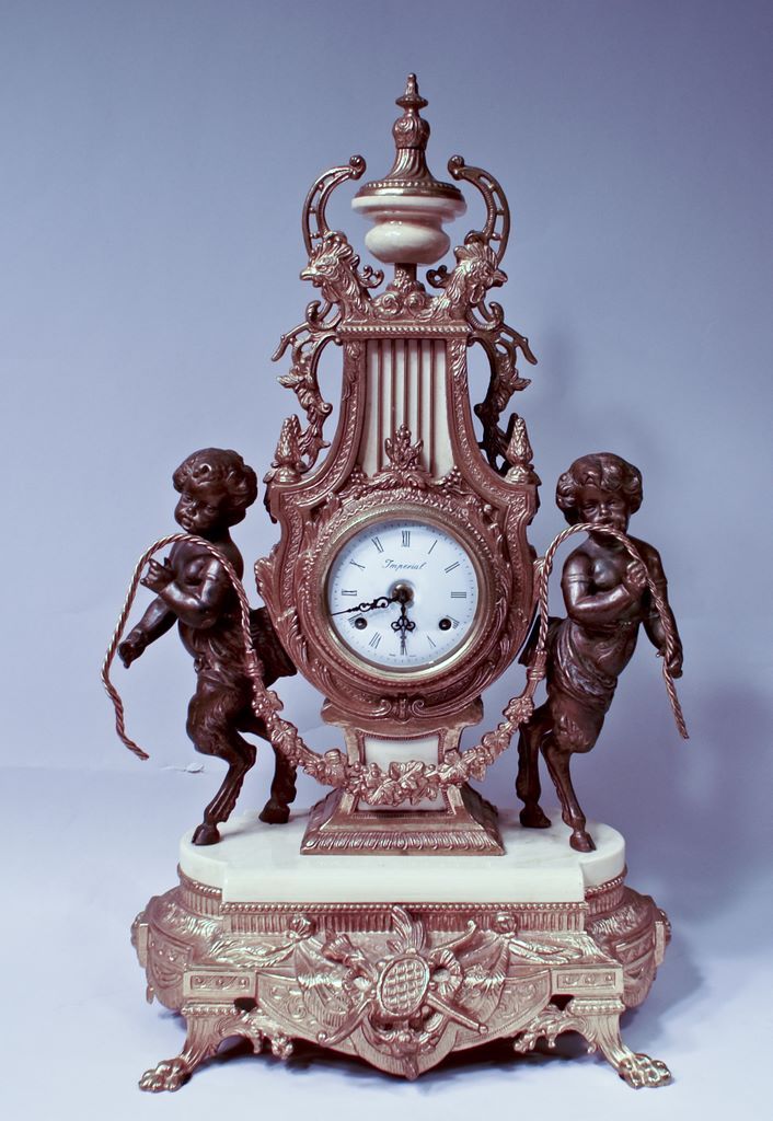 An elegant Italian Imperial 24"h x 13 1/2"w gilt bronze mantle clock with porcelain Roman dial, featuring bronze satyrs flanking a lyre shaped case, mounted on an ornate marble capped gilt brass base. An elegant Italian Imperial 24"h x 13 1/2"w gilt bronze mantle clock with porcelain Roman dial, featuring bronze satyrs flanking a lyre shaped case, mounted on an ornate marble capped gilt brass base.