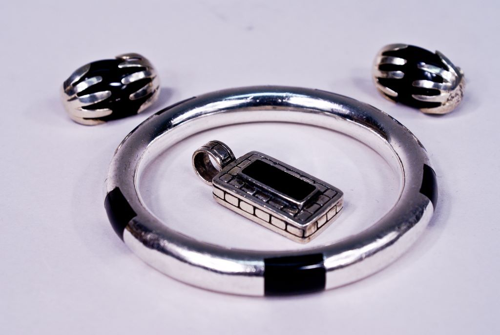 Four pieces of Mexican sterling & onyx Jewelry, including a pair of earrings, a pendant, and an inlaid bangle bracelet, 76.7 grams total. Four pieces of Mexican sterling & onyx Jewelry, including a pair of earrings, a pendant, and an inlaid bangle bracelet, 76.7 grams total.