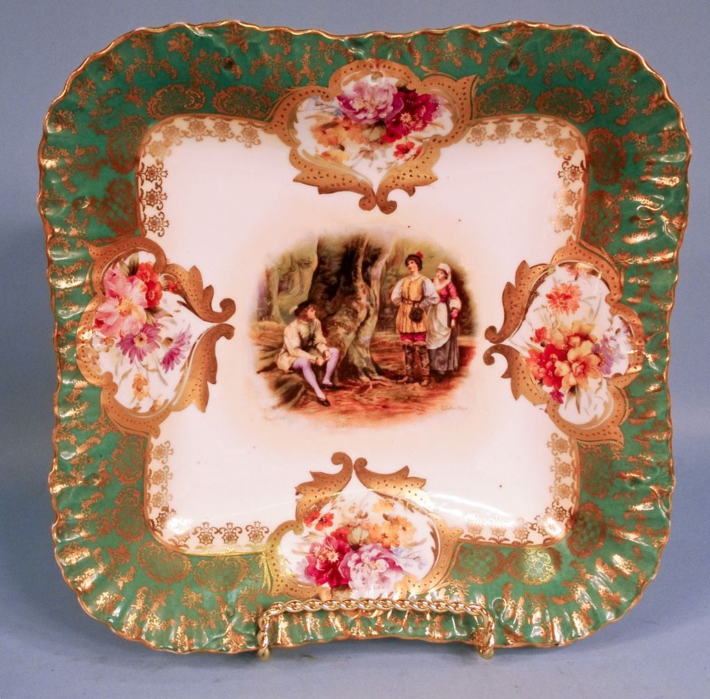 A late 19th Century Victoria Austria gilded & hand decorated 9 1/2" square bowl, signed Walter Puget. Illustrated with a scene from Shakespeare's "As You Like It", when Orlando, Gannymede/Rosalind and Celia meet in the Forest of Arden. A late 19th Century Victoria Austria gilded & hand decorated 9 1/2" square bowl, signed Walter Puget. Illustrated with a scene from Shakespeare's "As You Like It", when Orlando, Gannymede/Rosalind and Celia meet in the Forest of Arden.