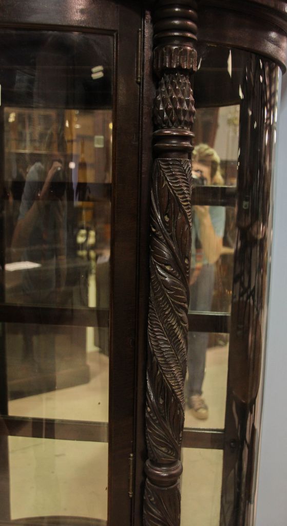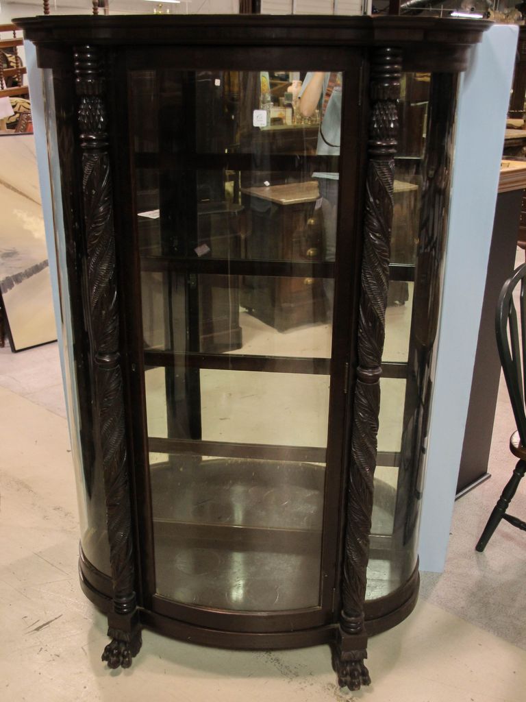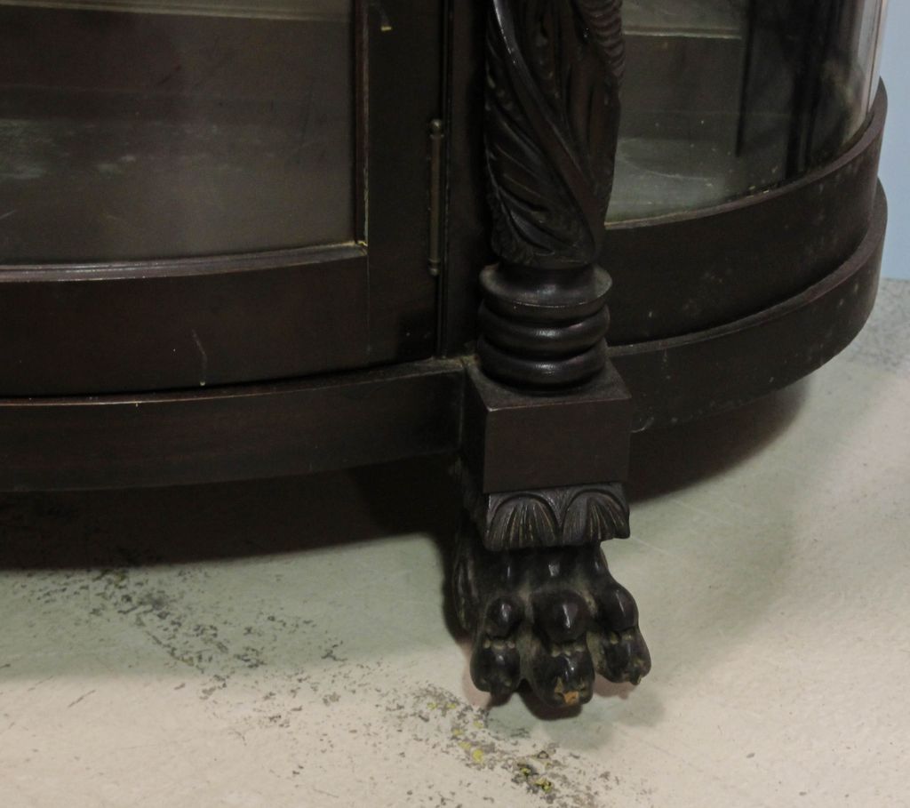 Late 19th century mahogany bow front china cabinet with two glass shelves, two wood shelves, acanthus carved columns and paw feet.; 40" w., 7" d., 63 1/2" h. Late 19th century mahogany bow front china cabinet with two glass shelves, two wood shelves, acanthus carved columns and paw feet.; 40" w., 7" d., 63 1/2" h.