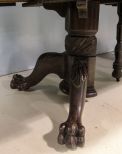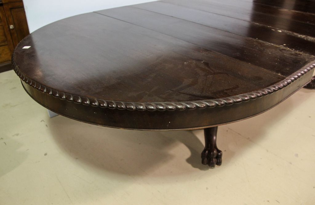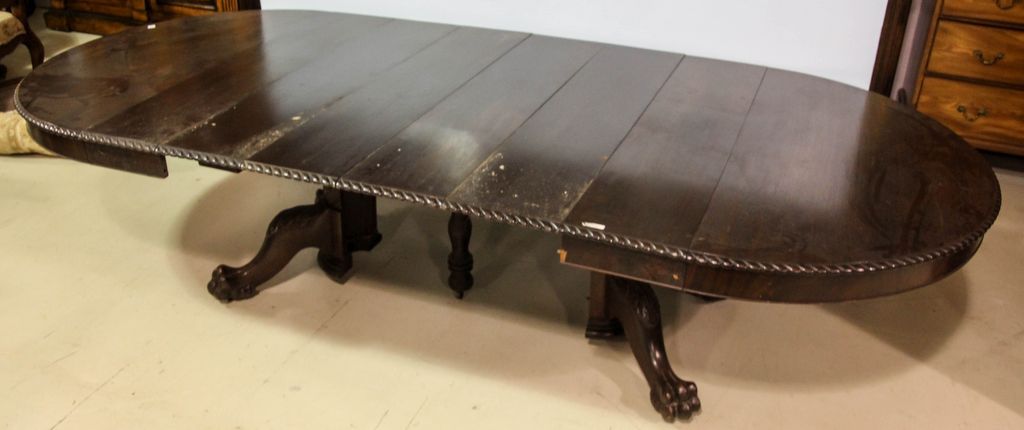 19th century mahogany empire style dining table that has gadrooning on the edges, carved split pedestal, paw feet and six 11" leaves (one skirted); 54" dia., 29" h. 19th century mahogany empire style dining table that has gadrooning on the edges, carved split pedestal, paw feet and six 11" leaves (one skirted); 54" dia., 29" h.