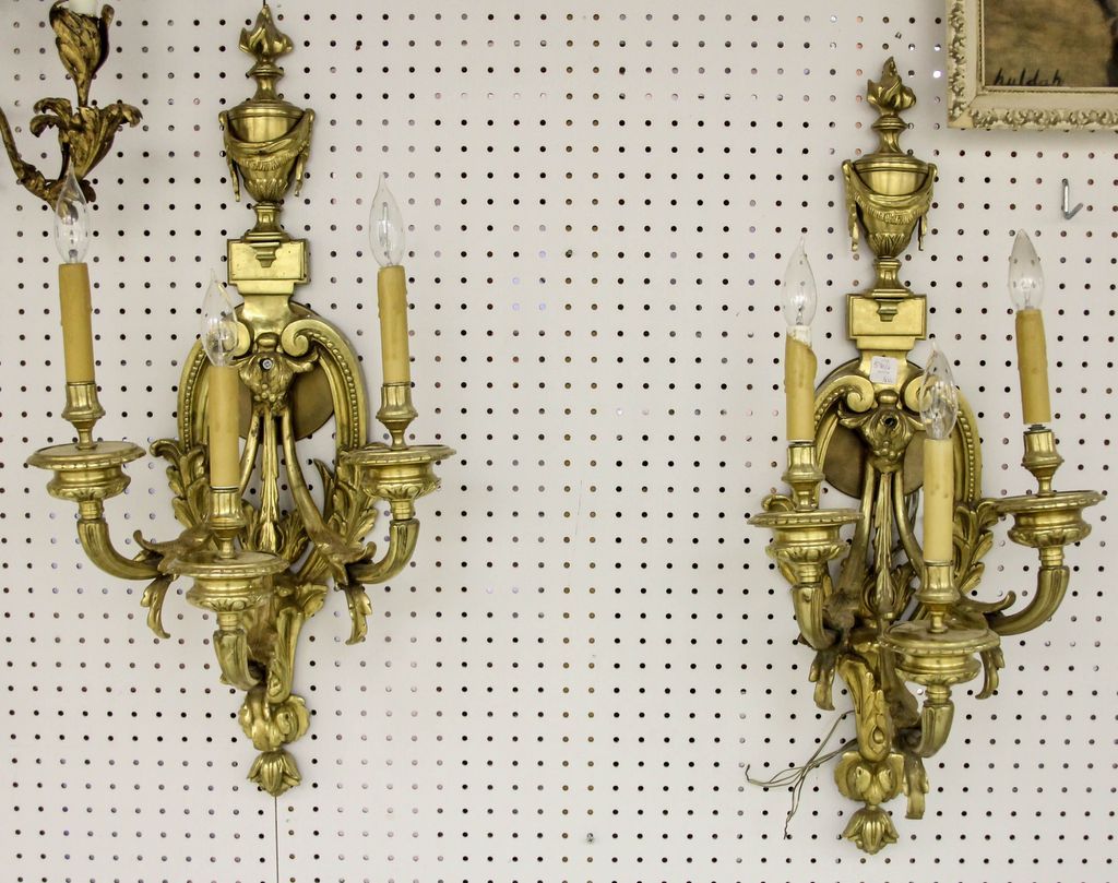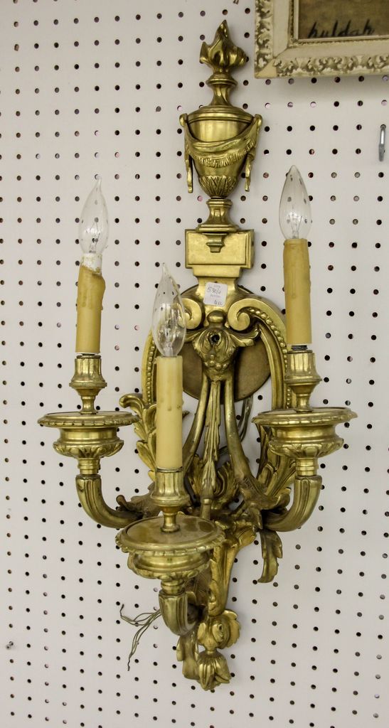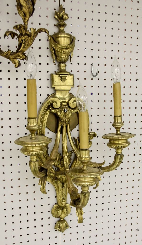 Large pair of classical design urn with swag three arm electric candle arm sconces.; 13" w., 31" h. Large pair of classical design urn with swag three arm electric candle arm sconces.; 13" w., 31" h.