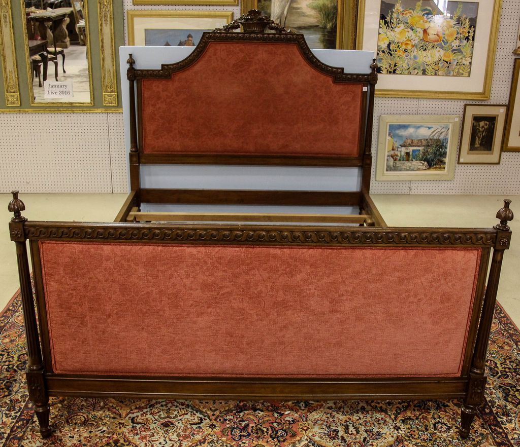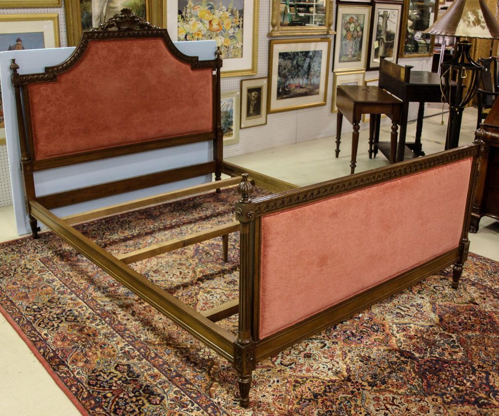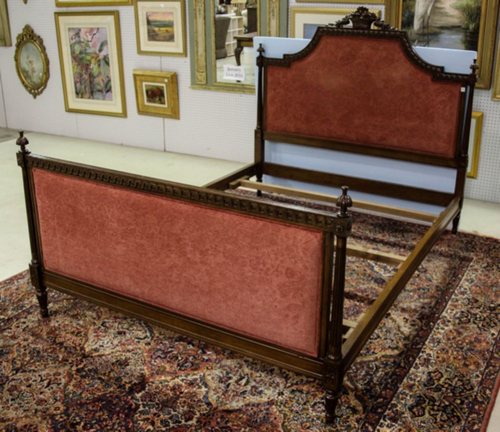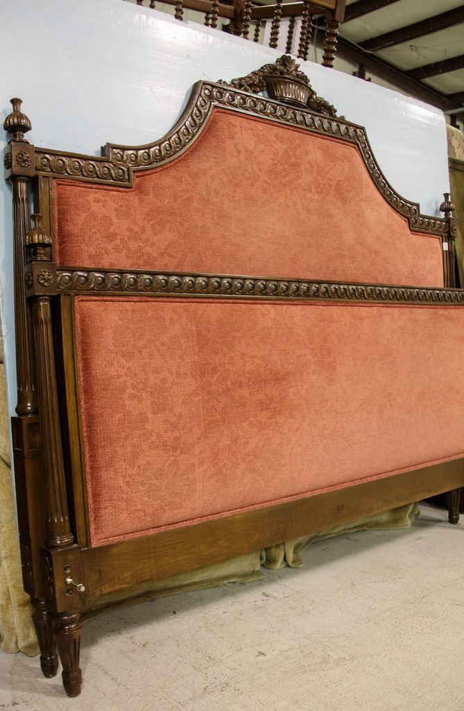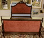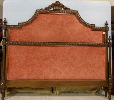 Walnut French style upholstered queen size bed.; 54" h. Walnut French style upholstered queen size bed.; 54" h.