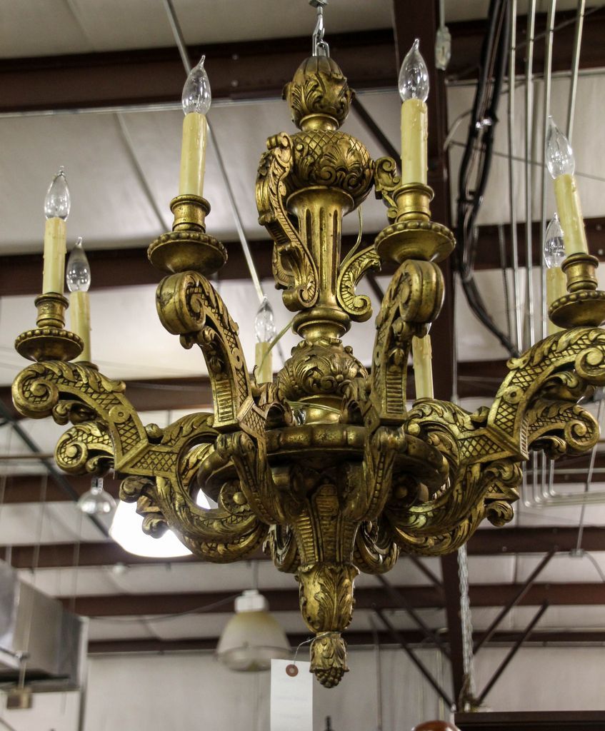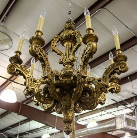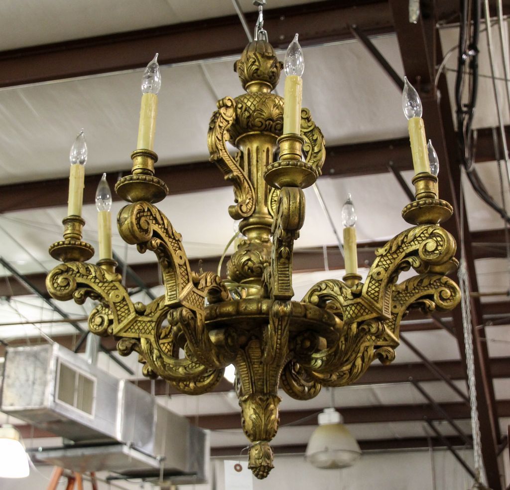 Eight arm wood gilt candlelight chandelier.; 31" dia., 32" h. Eight arm wood gilt candlelight chandelier.; 31" dia., 32" h.