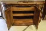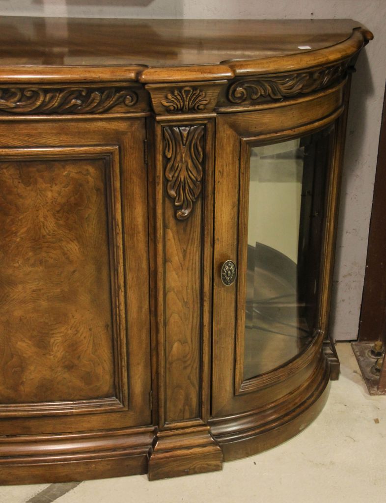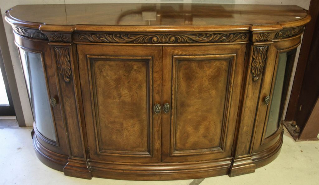 Large Henredon buffet with burl wood top and two center doors flanked by two beveled glass doors.; 80" w., 27" d., 43" h. Large Henredon buffet with burl wood top and two center doors flanked by two beveled glass doors.; 80" w., 27" d., 43" h.