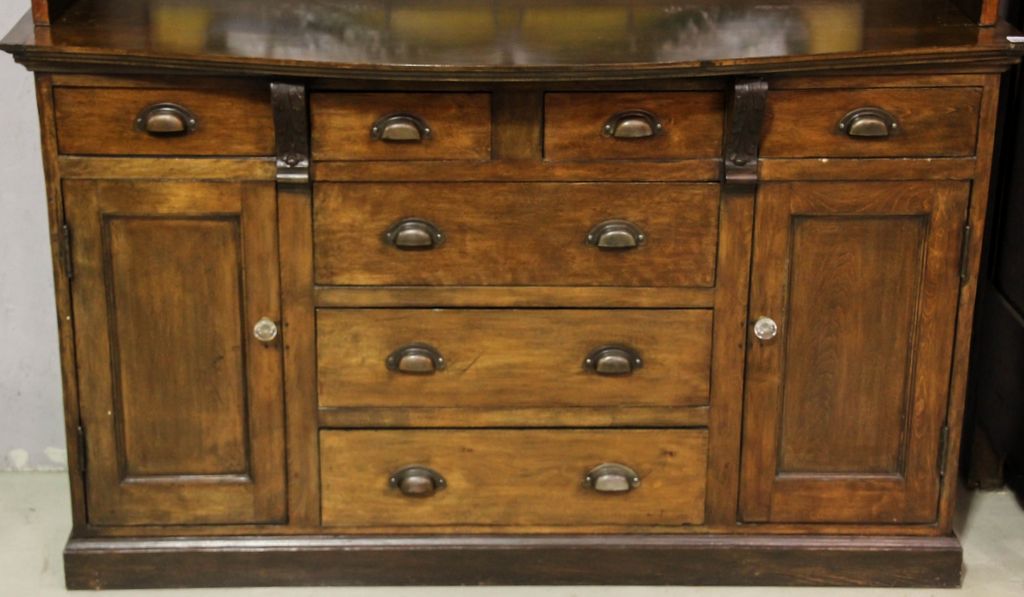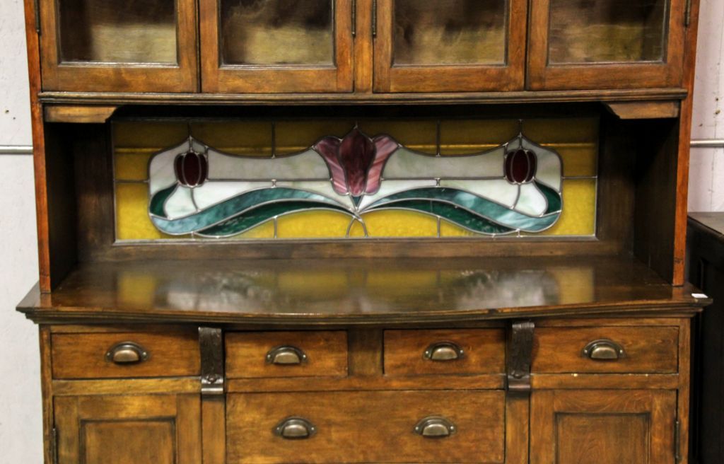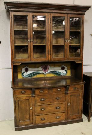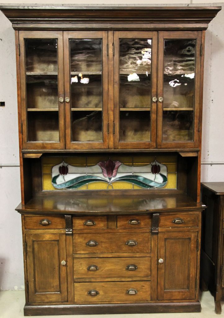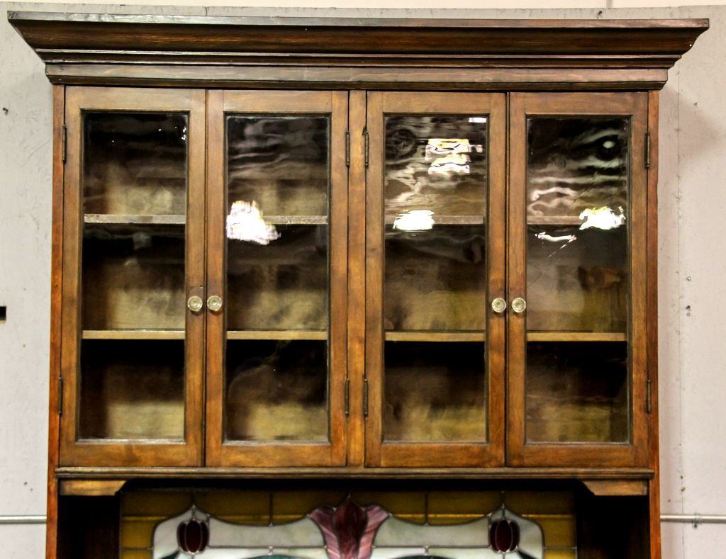 Two section cabinet, top section has four glass doors with three interior shelves and open section with stained glass. Bottom section has four drawers over three center drawers and two side doors.; 56" w., 22" d., 91" h. Two section cabinet, top section has four glass doors with three interior shelves and open section with stained glass. Bottom section has four drawers over three center drawers and two side doors.; 56" w., 22" d., 91" h.
