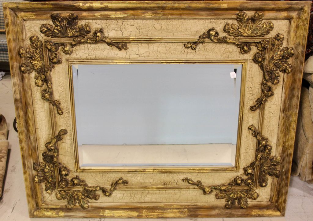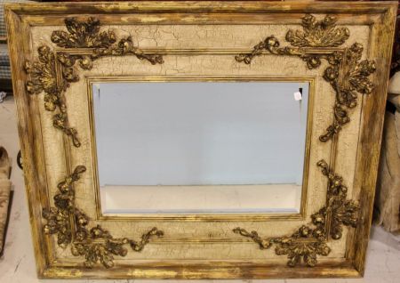 Large decorative mirror with crackle finish, beveled mirror and applied gold leaves.; 61 1/2" w., 50" h. Large decorative mirror with crackle finish, beveled mirror and applied gold leaves.; 61 1/2" w., 50" h.