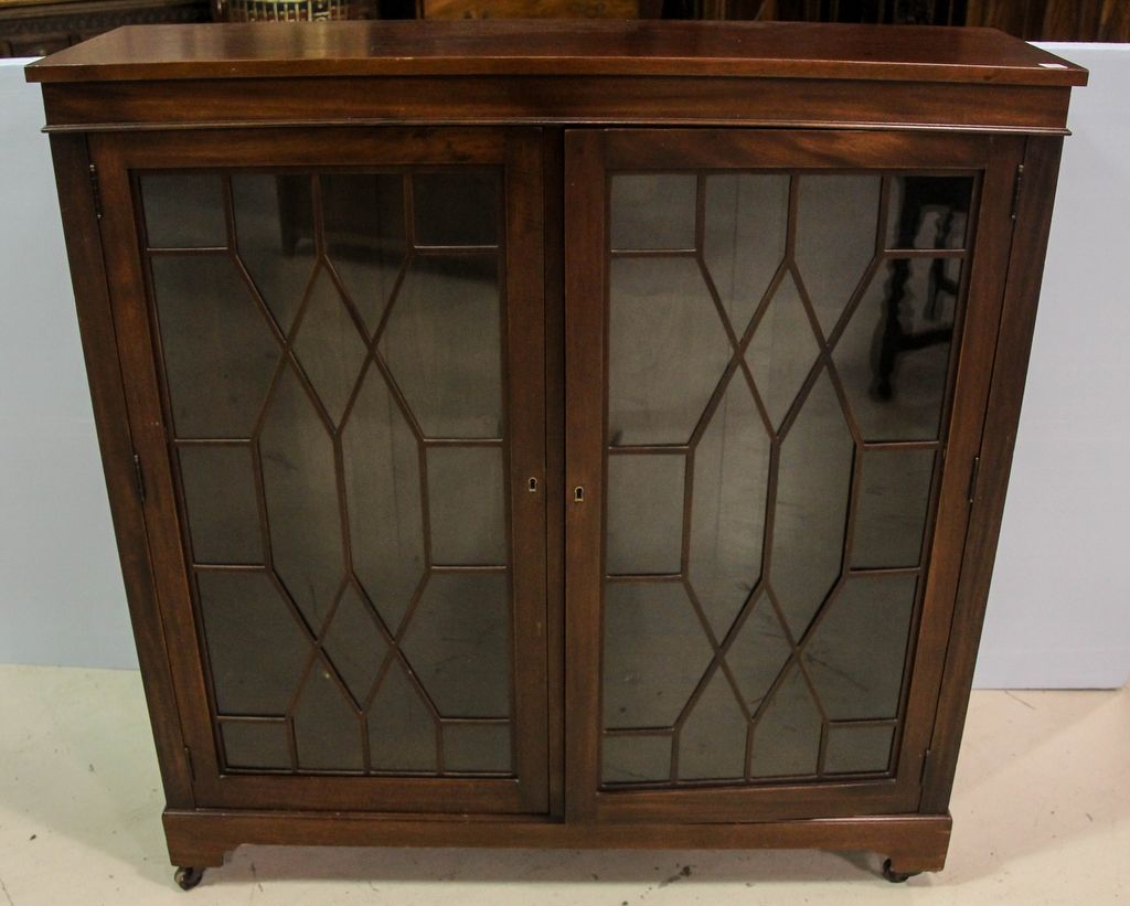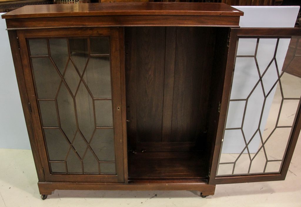 Mahogany empire style bookcase with two doors with applied lattice molding, interior shelves and is on rollers.; 47 1/2" w., 14 1/2" d., 49" h. Mahogany empire style bookcase with two doors with applied lattice molding, interior shelves and is on rollers.; 47 1/2" w., 14 1/2" d., 49" h.