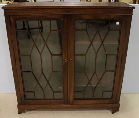 Mahogany empire style bookcase with two doors with applied lattice molding, interior shelves and is on rollers.; 47 1/2" w., 14 1/2" d., 49" h. Mahogany empire style bookcase with two doors with applied lattice molding, interior shelves and is on rollers.; 47 1/2" w., 14 1/2" d., 49" h.