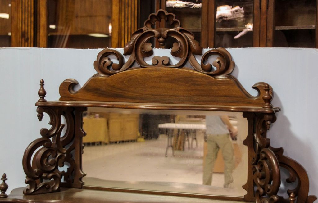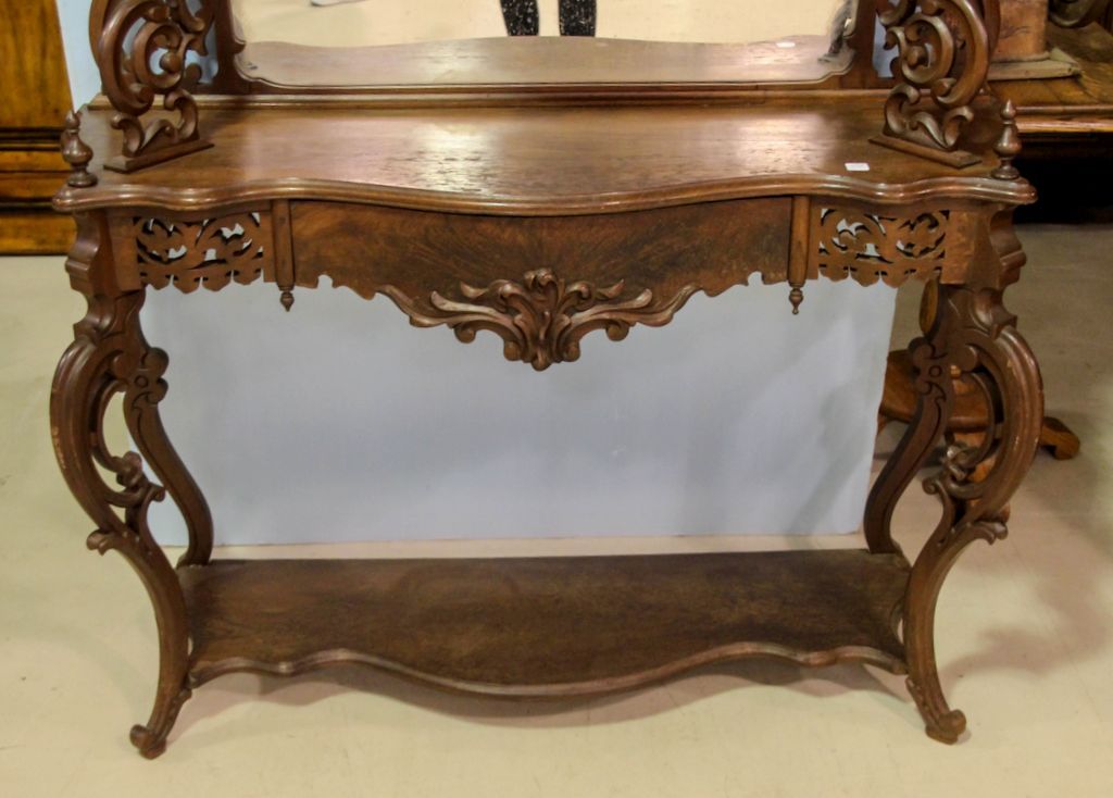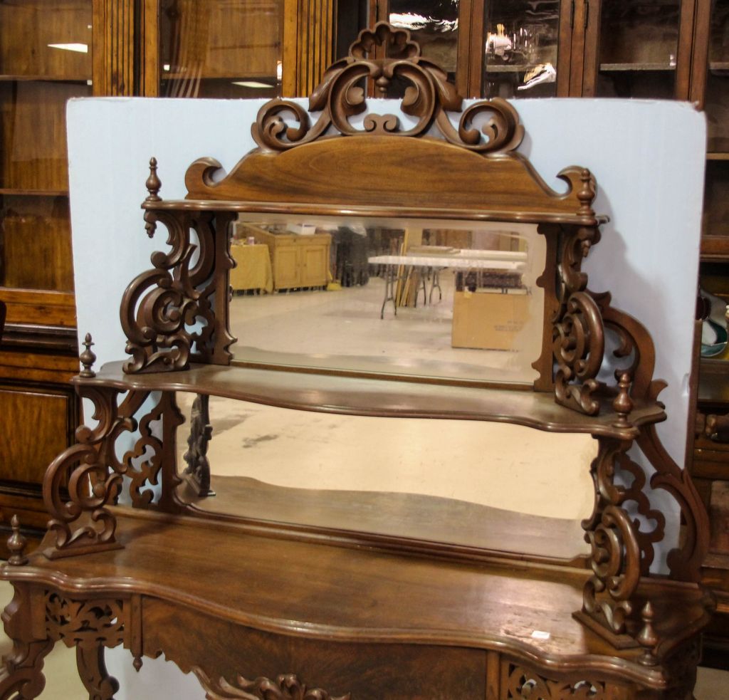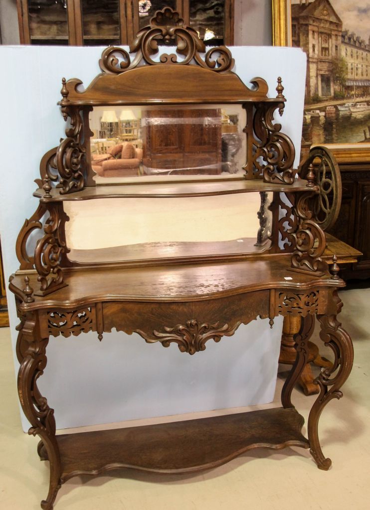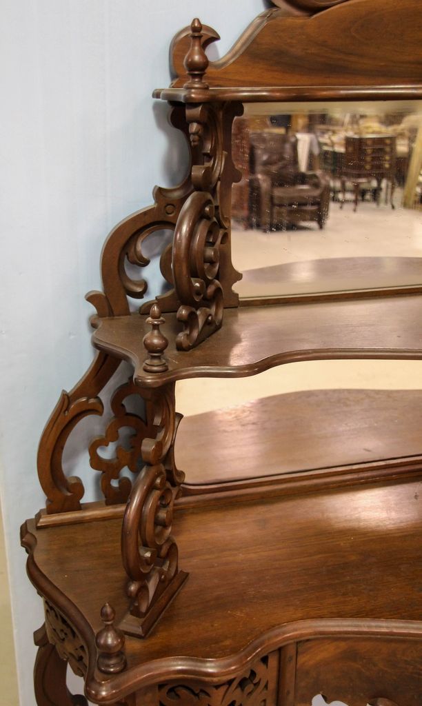Three shelf Victorian walnut etegere with a scroll cartouche, carved bracket supports and center drawer with bottom shelf.; 46" w., 17" d., 70" h. Three shelf Victorian walnut etegere with a scroll cartouche, carved bracket supports and center drawer with bottom shelf.; 46" w., 17" d., 70" h.