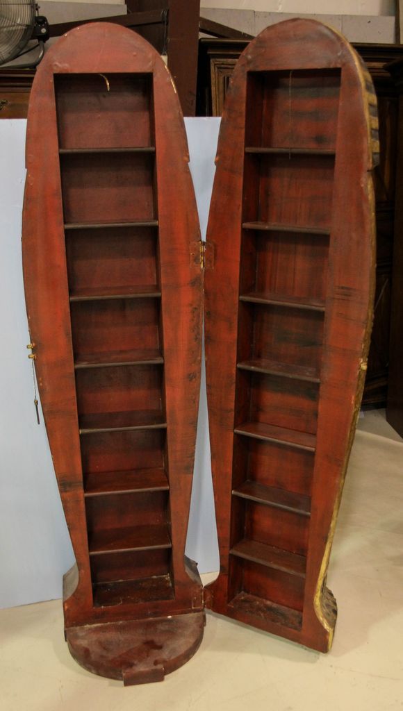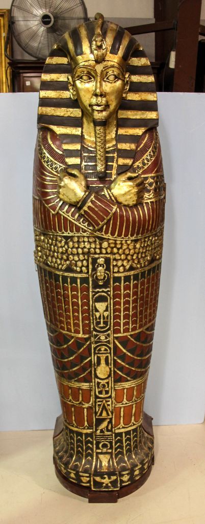 Highly decorated painted King Tut bookcase.; 21" w., 17" d., 75" h. Highly decorated painted King Tut bookcase.; 21" w., 17" d., 75" h.