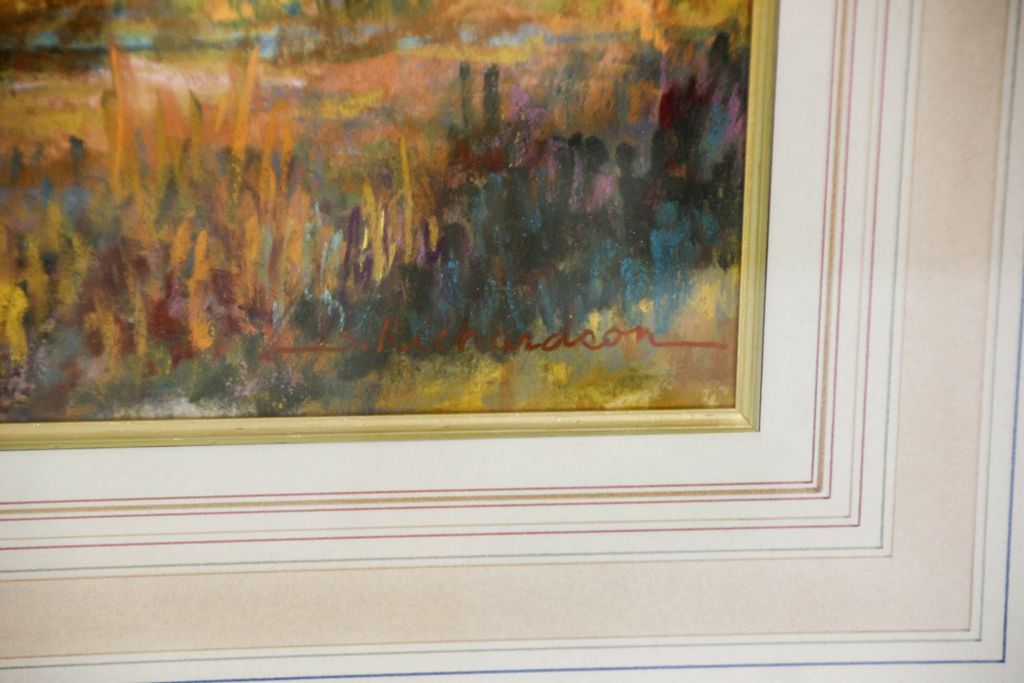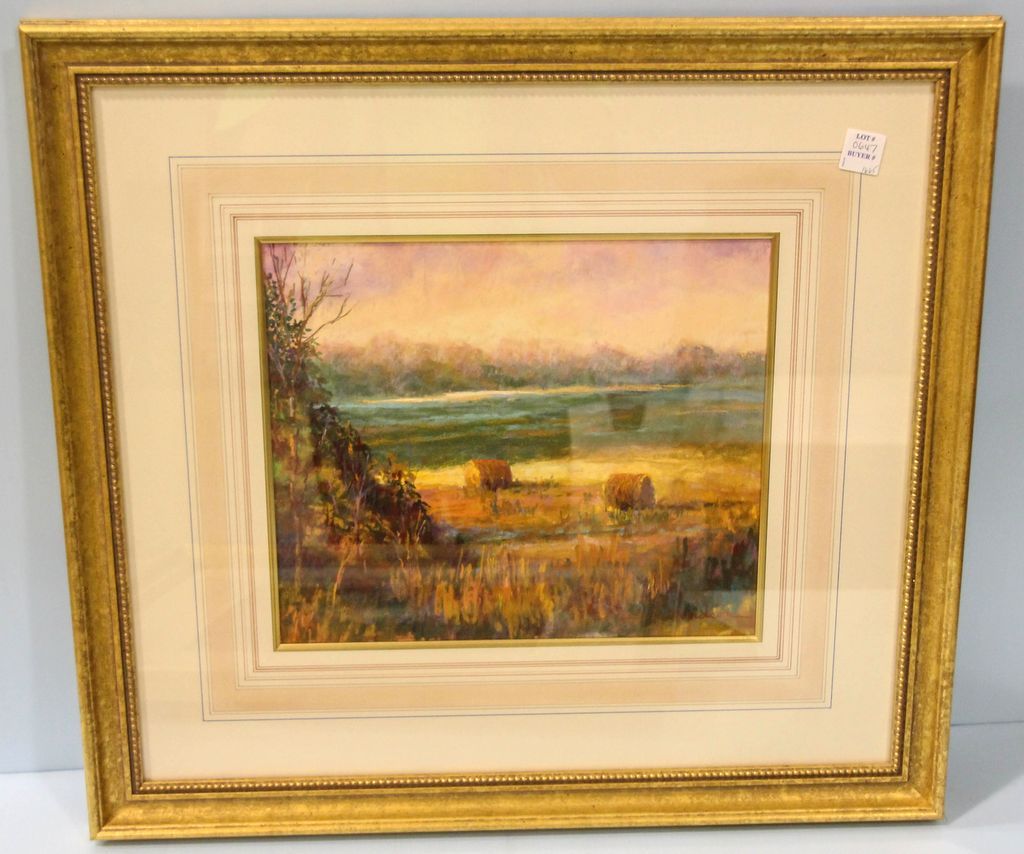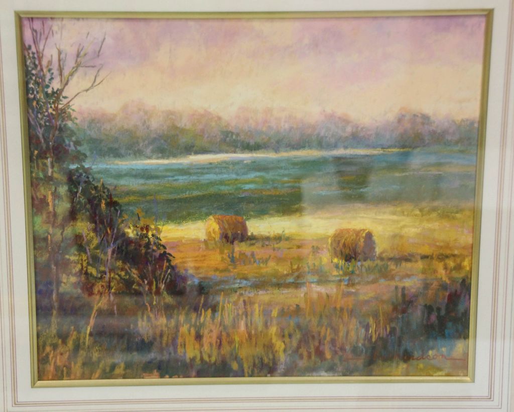 Pastel drawing of landscape and hay bales entitled "Just After Sunrise" by Sharon Richardson (Natchez, Mississippi); Image- 13"x 11"; Frame- 23 1/2"x 21 1/2" Pastel drawing of landscape and hay bales entitled "Just After Sunrise" by Sharon Richardson (Natchez, Mississippi); Image- 13"x 11"; Frame- 23 1/2"x 21 1/2"