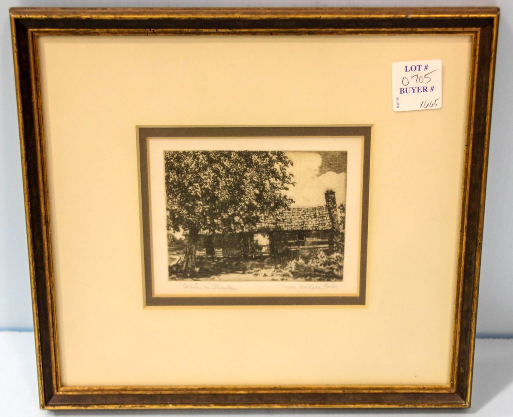 Etching signed and titled "Cabin in Shade" by Mary Wallace Kirk (Tuscumbia, Alabama 1889-1978); Image- 5"x 4"; Frame- 9 1/2"x 9" Etching signed and titled "Cabin in Shade" by Mary Wallace Kirk (Tuscumbia, Alabama 1889-1978); Image- 5"x 4"; Frame- 9 1/2"x 9"