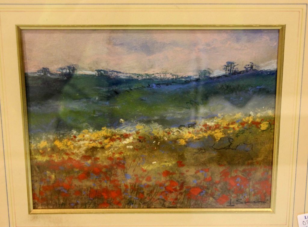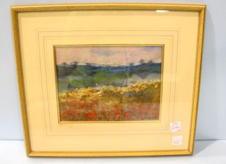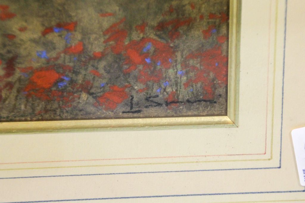 Pastel drawing of red yellow and blue flowers in a field, non-legible signature.; Image- 9"x 7"; Frame- 16"x 14" Pastel drawing of red yellow and blue flowers in a field, non-legible signature.; Image- 9"x 7"; Frame- 16"x 14"