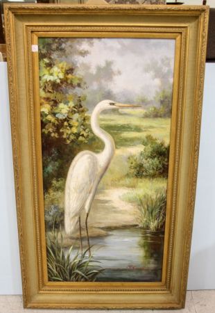 Large oil on canvas of egret signed J. Cowan.; 33" w., 59" h. Large oil on canvas of egret signed J. Cowan.; 33" w., 59" h.