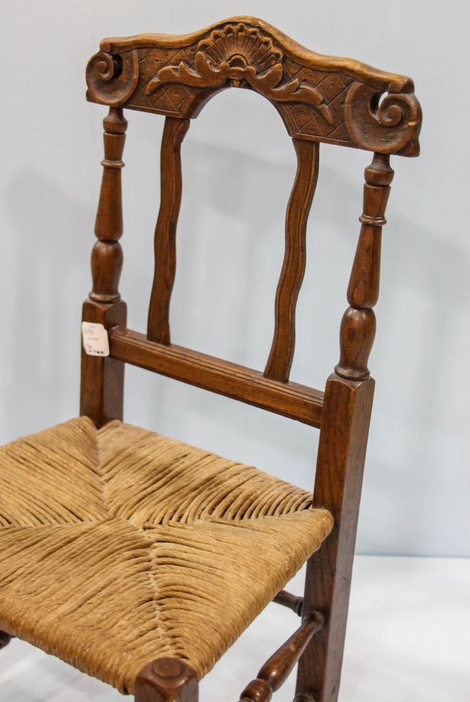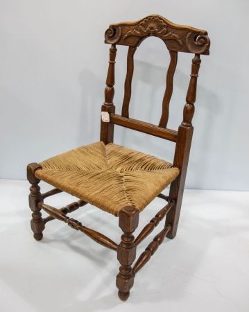 19th century child's chair with rush seat.; 13" w., 11 1/2" d., 24" h. 19th century child's chair with rush seat.; 13" w., 11 1/2" d., 24" h.