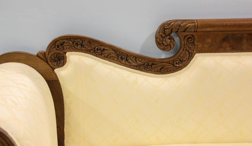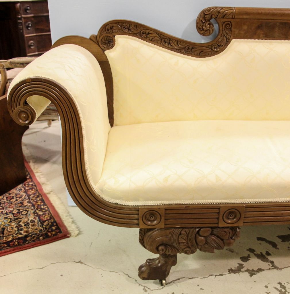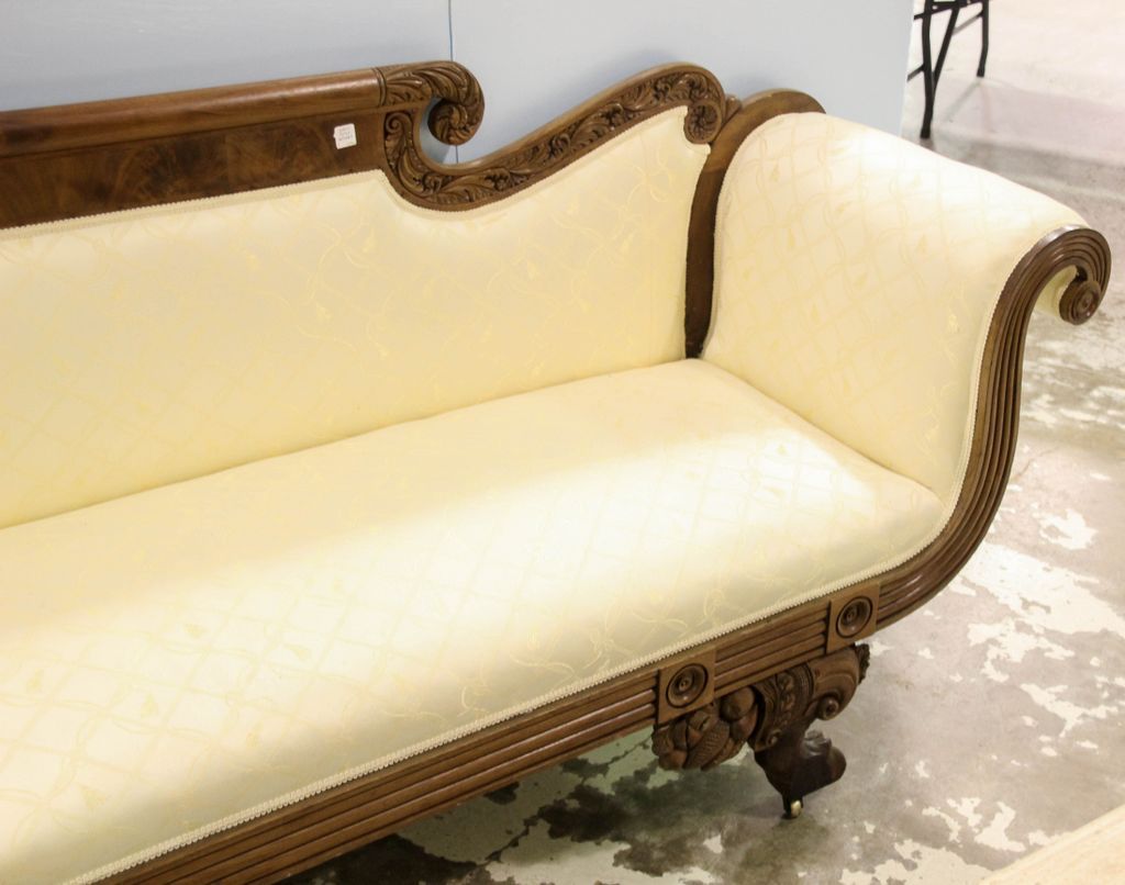 1840 mahogany empire sofa with carved cornucopia, fruit and paw feet.; 91" w., 25" d., 34" h. 1840 mahogany empire sofa with carved cornucopia, fruit and paw feet.; 91" w., 25" d., 34" h.