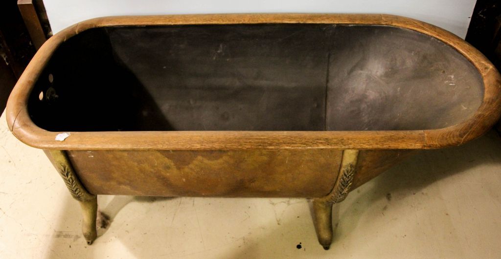 Early 20th century copper bathtub with brass feet and oak rim.; 59" long, 26" w., 22" h. Early 20th century copper bathtub with brass feet and oak rim.; 59" long, 26" w., 22" h.