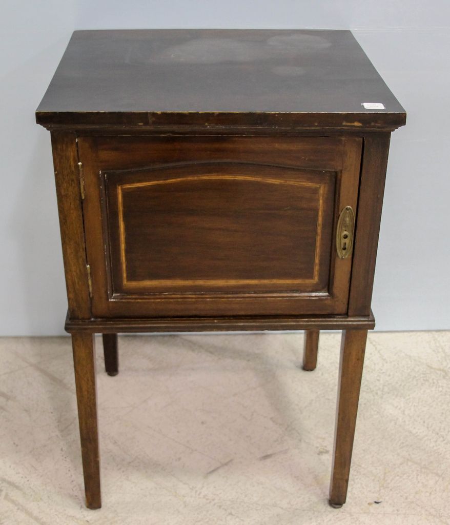 Edwardian single door Hepplewhite style side commode.; 19" w., 17" d., 29" h. Edwardian single door Hepplewhite style side commode.; 19" w., 17" d., 29" h.