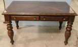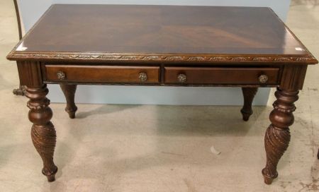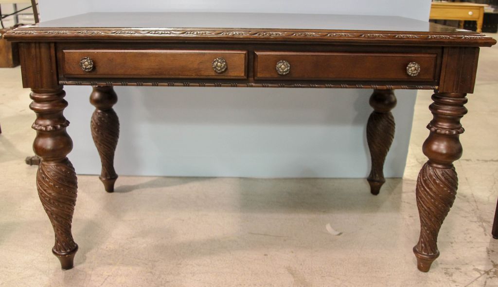 Mahogany two drawer desk with carved border and twist carved legs.; 52" w., 30" h., 30" d. Mahogany two drawer desk with carved border and twist carved legs.; 52" w., 30" h., 30" d.