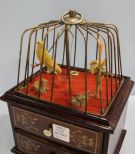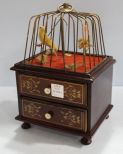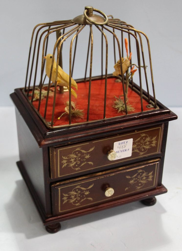Two drawer jewelry mechanical bird music box. The bird swings and box plays music when drawer opens, stenciling on drawers.; 7" w., 6" d., 11" h. Two drawer jewelry mechanical bird music box. The bird swings and box plays music when drawer opens, stenciling on drawers.; 7" w., 6" d., 11" h.