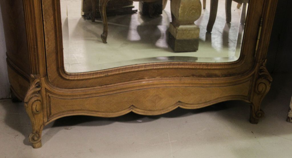 19th century Country French single door armoire with beveled glass center door and roses and scroll carved crest.; 41" w., 20" d., 97" h. 19th century Country French single door armoire with beveled glass center door and roses and scroll carved crest.; 41" w., 20" d., 97" h.